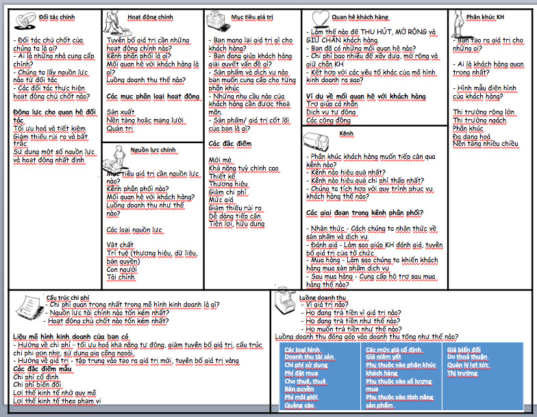 BMC bao gồm 9 yếu tố cốt lõi, thể hiện đầy đủ cách doanh nghiệp tạo ra giá trị, truyền tải giá trị đó đến khách hàng, và thu về lợi nhuận. Mô hình này đặc biệt hữu ích cho startup, doanh nghiệp vừa và nhỏ, các tổ chức muốn đổi mới mô hình hoạt động mà không cần lập kế hoạch kinh doanh dài dòng.